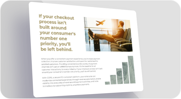 If your checkout process isn’t built around your consumer's number one priority, you’ll be left behind. When you offer a convenient payment experience, you increase payment collection, improve customer satisfaction, and pave the road ahead for satisfied customers. Providing convenience and a variety of payment channels isn’t just an added bonus anymore. It’s the baseline for all customer interactions, for every industry. If your checkout process isn’t built around your consumer’s number one priority, you’ll be left behind. With CORE, a secure PCI-compliant platform, your enterprise can modernize connected experiences through revenue automation, enable visibility into every step of revenue and payment activities, and incite immediacy by supporting anytime, anywhere payments.