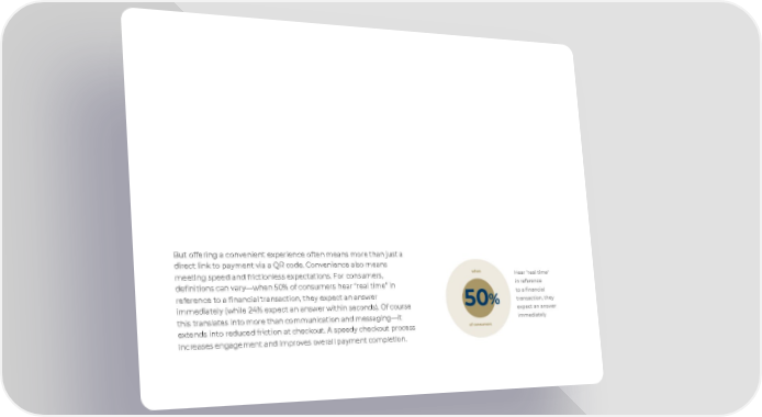 But offering a convenient experience often means more than just a direct link to payment via a QR code. Convenience also means meeting speed and frictionless expectations. For consumers, definitions can vary—when 50% of consumers hear “real time” in reference to a financial transaction, they expect an answer immediately (while 24% expect an answer within seconds). Of course this translates into more than communication and messaging—it extends into reduced friction at checkout. A speedy checkout process increases engagement and improves overall payment completion.