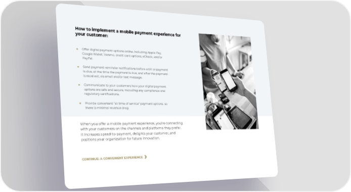 How to implement a mobile payment experience for your customer: ● Offer digital payment options online, including Apple Pay, Google Wallet, Venmo, credit card options, eCheck, and/or PayPal. ● Send payment reminder notifications before a bill or payment is due, at the time the payment is due, and after the payment is received, via email and/or text message. ● Communicate to your customers how your digital payment options are safe and secure, including any compliance and regulatory certifications. ● Provide convenient “at time of service” payment options so there is minimal revenue drag When you offer a mobile payment experience, you’re connecting with your customers on the channels and platforms they prefer. It increases speed-to-payment, delights your customer, and positions your organization for future innovation. CONTINUE: A CONVENIENT EXPERIENCE