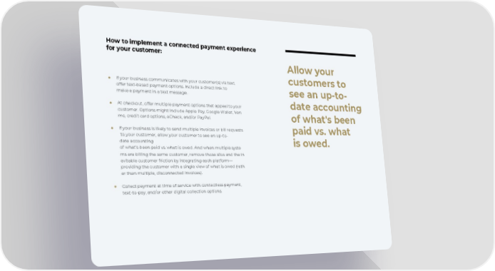 How to implement a connected payment experience for your customer: Allowyour ● If your business communicateswithyourcustomer(s)viatext, customersto offer text-based payment options. Include a direct link to see an up-to- makea paymentinatextmessage. ● Atcheckout,offermultiplepaymentoptionsthatappealtoyour dateaccounting customer.OptionsmightincludeApplePay,GoogleWallet,Ven mo,creditcardoptions,eCheck,and/orPayPal. of what's been ● If your business is likely to send multiple invoices or bill requests paid vs. what to your customer, allow your customertosee an up-to- dateaccounting is owed. of what’s been paid vs. what is owed. And when multiple syste msarebillingthesamecustomer,removethosesilosandthein evitable customerfriction by integrating each platform— providingthecustomerwithasingleviewofwhatisowed(rath er than multiple, disconnected invoices). ● Collect paymentattimeofservicewithcontactlesspayment, text-to-pay, and/or other digital collection options.